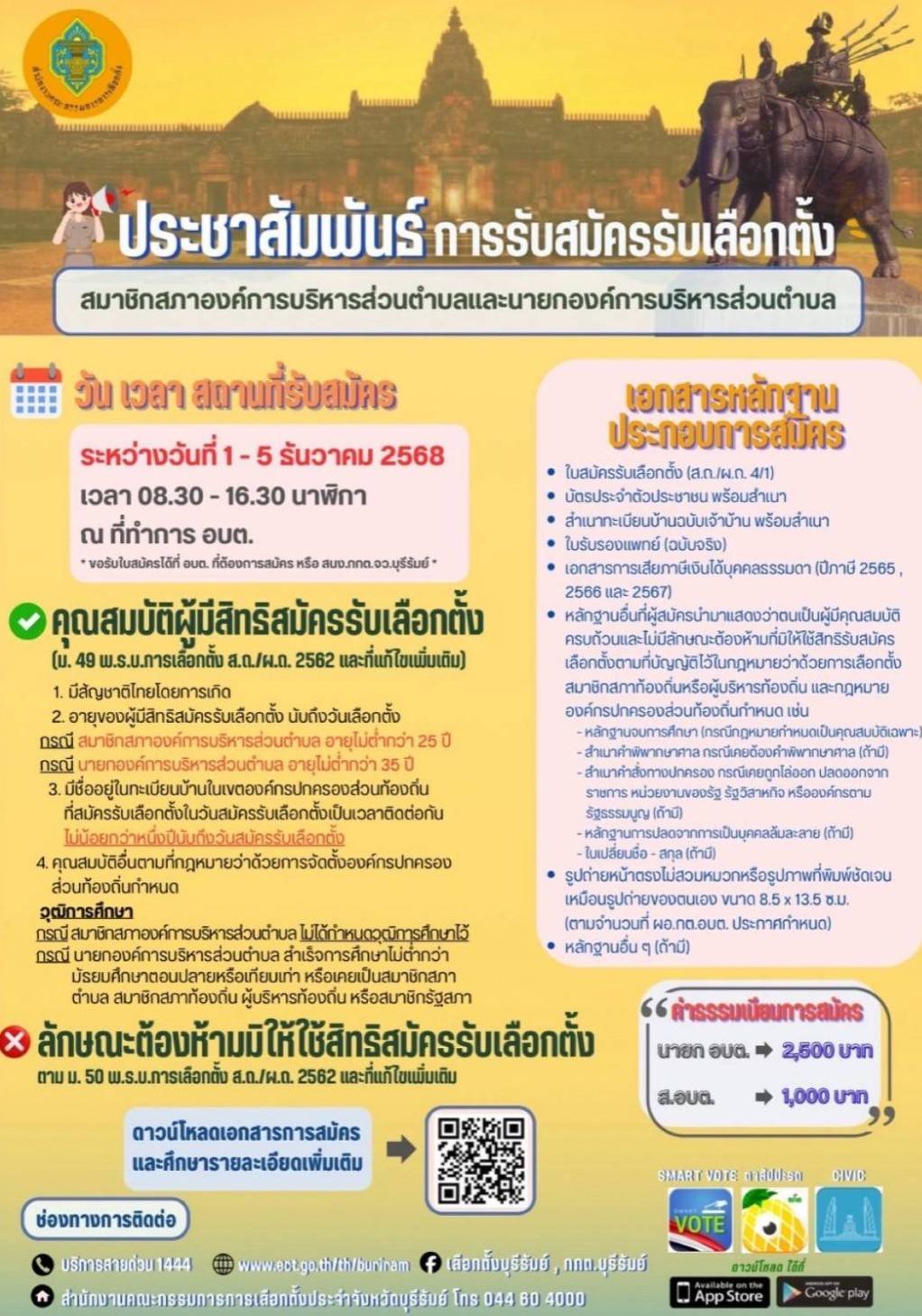 วันที่ 29 ตุลาคม 2568 ประชาสัมพันธ์การรับสมัครรับเลือกตั้ง สมาชิกสภาองค์การบริหารส่วนตำบลและนายกองค์การบริหารส่วนตำบล