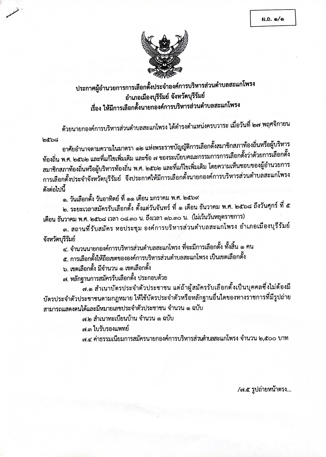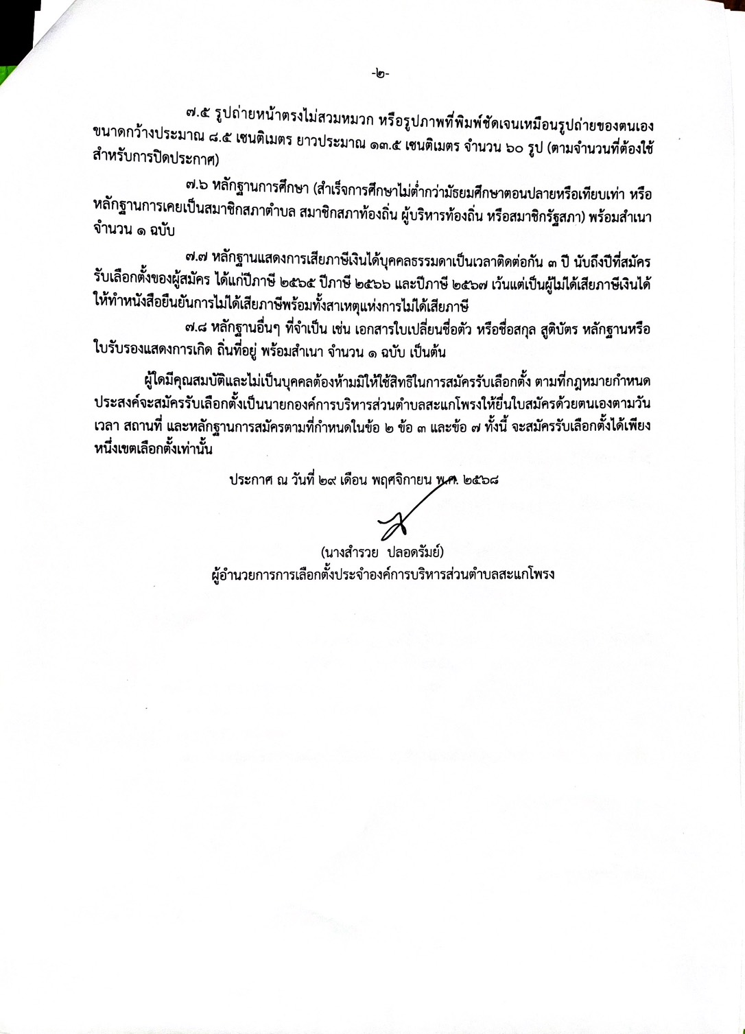 วันที่ 29 พฤศจิกายน 2568 ประกาศผู้อำนวยการเลือกตั้งประจำองค์การบริหารส่วนตำบลสะแกโพรง อำเภอเมืองบุรีรัมย์ จังหวัดบุรีรัมย์ เรื่อง ให้มีการเลือกตั้งนายกองค์การบริหารส่วนตำบลสะแกโพรง
