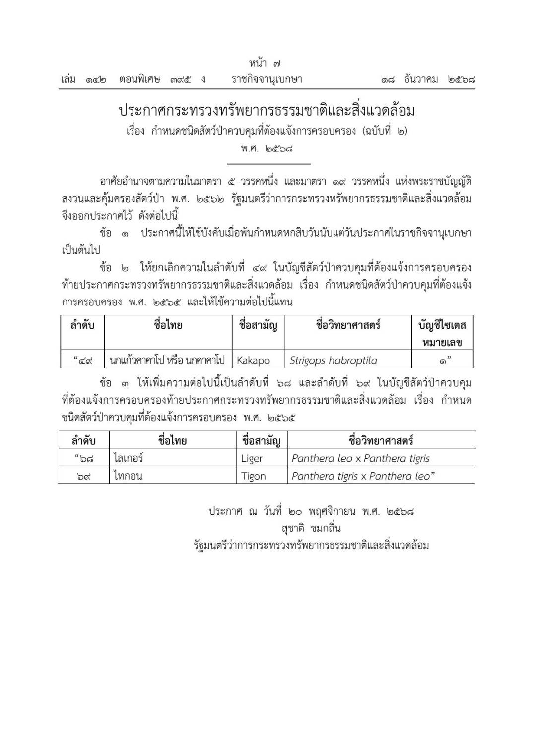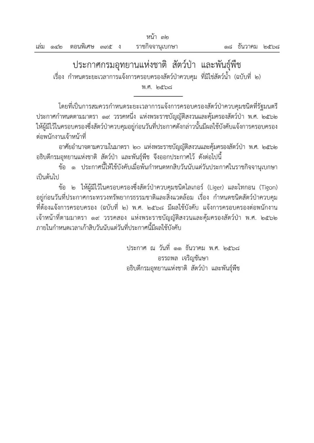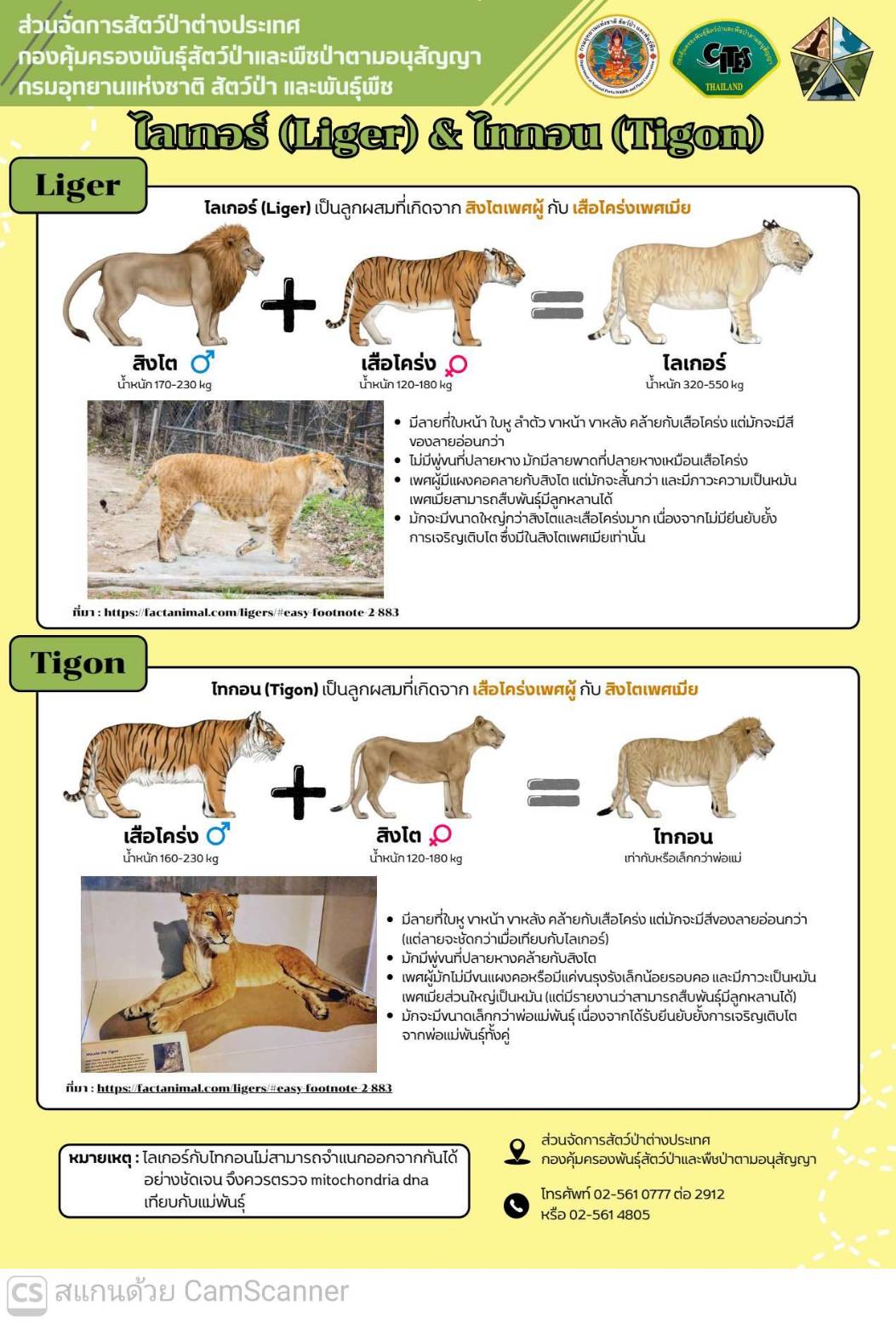 วันที่ 2 เมษายน 2569 ประชาสัมพันธ์แจ้งการครอบครองสัตว์ป่าควบคุมชนิดไลเกอร์ (Panthera leo xPanthera tigris) และไทกอน (Panthera tigris x Panthera leo)