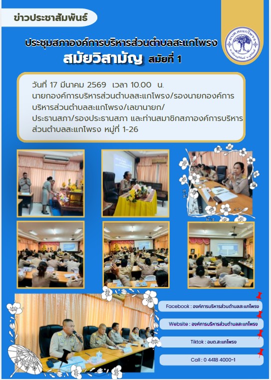วันที่ 17 มีนาคม 2569 ประชุมสภาองค์การบริหารส่วนตำบลสะแกโพรง สมัยวิสามัญ สมัยที่1